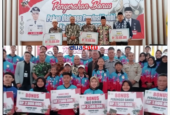 TEBOJAMBI,DUASATU.NET- Pemerintah Kabupaten (Pemkab) Tebo serahkan bonus atlet peraih medali dalam Pekan olahraga provinsi (Porprov) Jambi ke-23, dan bonus bagi kafilah yang berprestasi dalam MTQ tingkat Provinsi Jambi ke-52 di Sarolangun beberapa waktu lalu.